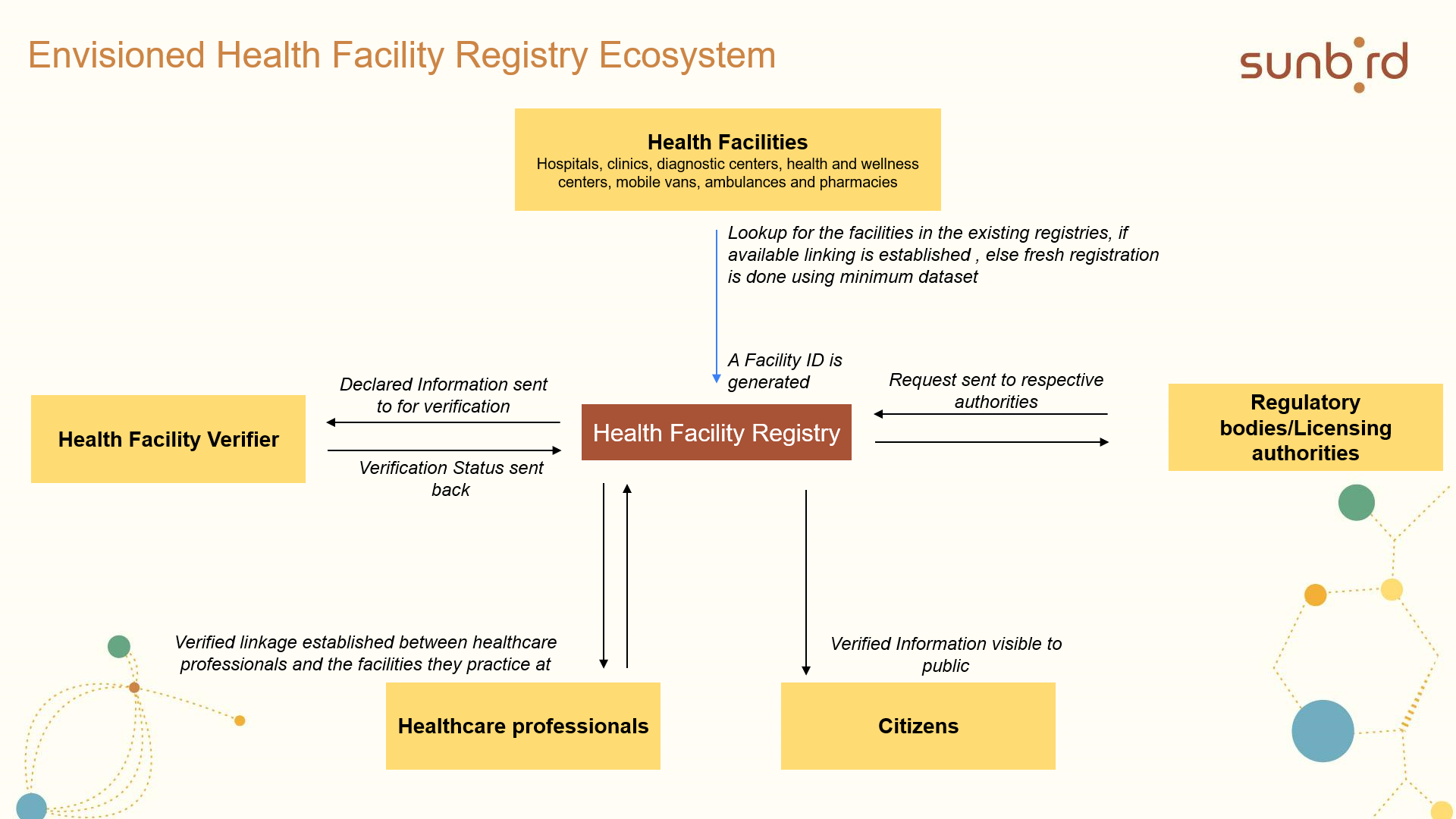 Health Facility Registry is a sample (a reference solution) built on Sunbird RC demonstrating registry of the health facilities available in a country which have registered on facility registry and enables verification of health facilities, fostering trust by providing reliable information on their locations, services and accreditation status etc.