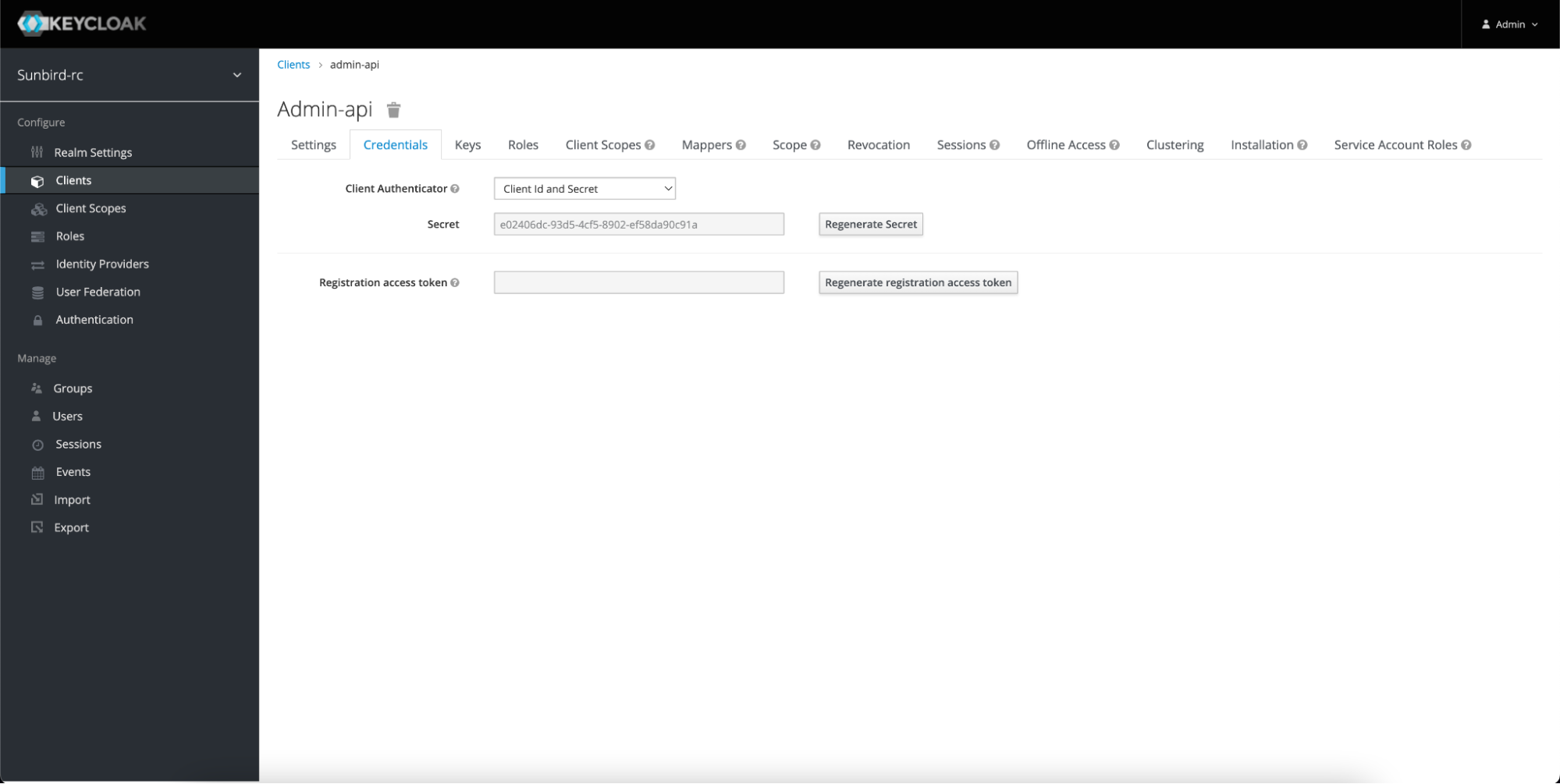 Once logged in, navigate to clients. Select admin-api. Go to the credentials tab and click on regenerate secret. Copy this secret. Create a .env file in the project repo and add KEYCLOAK\_SECRET as a environment variable with the value of the secret in the following format
