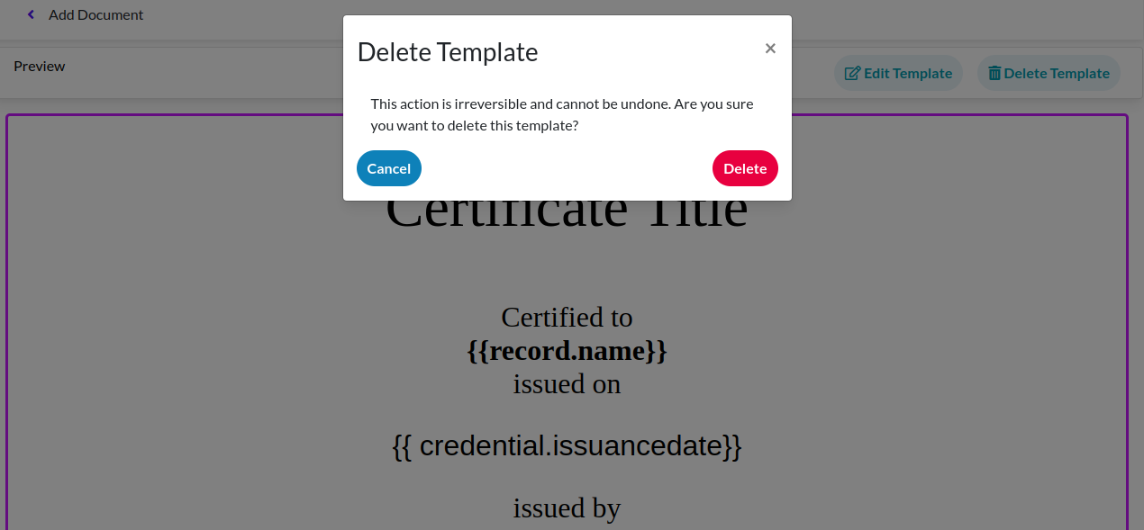 Please note that the action of deleting a template is irreversible. Exercise caution when choosing to delete a template, as all associated data will be permanently removed.